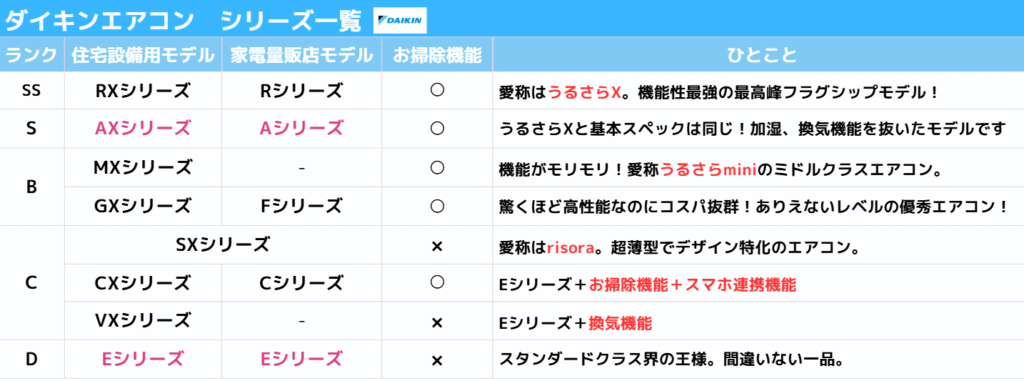 まず、紹介する機種がエアコン界でどのような位置づけいるかについて紹介!私の独断と偏見でモデルを分けた時に、AXシリーズはDランクに位置づくエアコンとなります。