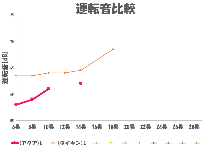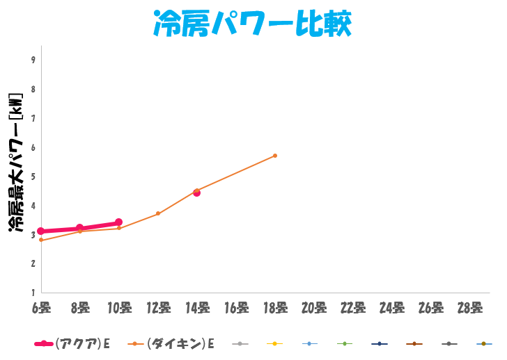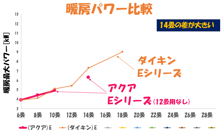 ①冷暖房パワー:14畳用以外は同じくらいの強さ!