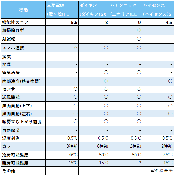 パナソニックのフィルター自動掃除などが搭載されていて、上位モデル並みですね。気になる所でいえば三菱電機とハイセンスの冷房可能温度が50℃未満であるところです。最近の酷暑を考えると、50℃は欲しいところですね。