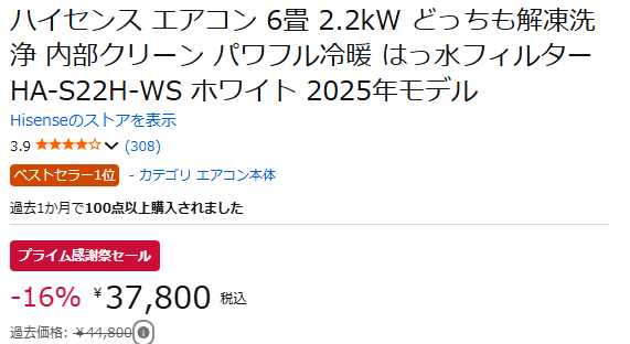 Amazonのプライム感謝祭セールではハイセンスの最新モデルがめちゃくちゃ安くなっています。(\37,800)機能もけっこう充実しているので安いエアコンを探している方には大チャンスだと思います!なんなら2024年モデルよりも安いです。