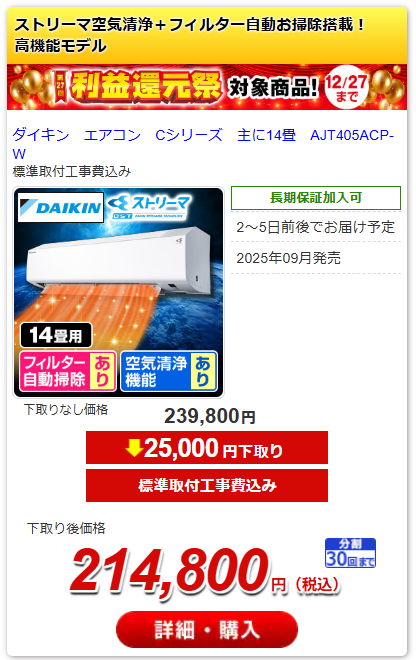 ジャパネットは家電量販店に比べると安めになっていますね。標準工事内で済む場合で且つ、エアコン下取りがある場合はアリかもですね。