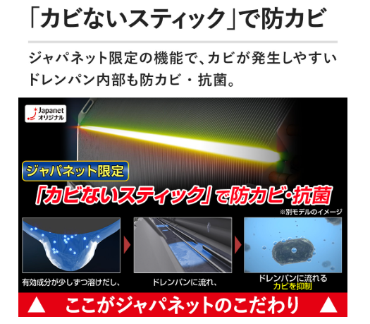 通常モデルをベースに、「カビないスティック」というオプション品がついたエアコンとなります。