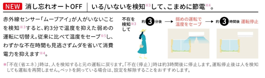 ペットがいる際は、この機能をOFFにしておかないと3時間後にめちゃくちゃ暑くなったり、冷えたりするので注意が必要です。